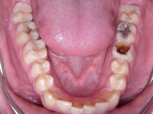 Von rechts nach links: Karies beginnt mit einem weissen Fleck (entkalkter Schmelz), der einbricht und weiches braunes Dentin offenlegt. Jetzt ist eine Reparatur = Füllung fällig. Der große Backenzahn hat bereits eine Amalgamfüllung. Übrigens: Dieser Patient hat vorne (rechts im Bild) seine Zähne besser gereinigt als weiter hinten. Deshalb entstand der größte Zahnschaden am hinteren Backenzahn (links im Bild). Und noch eine Erkenntnis: Weil der Zahnbelag in der Rinne zwischen Zahn und Zahnfleisch nicht so gut entfernt wurde wie auf den Glattflächen der Zähne, gibt es folgerichtig genau in dieser Rinne die Defekte. Da wo die Zähne gut von der Zahnbürste gereinigt wurden, strahlen sie, dass man fast eine Sonnenbrille braucht! 😉